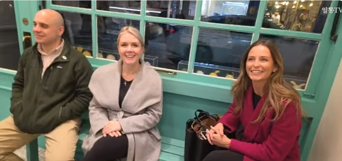 캐롤라인 레빗 대변인(가운데)과 마고 마틴 커뮤니케이션 담당 특별보좌관(오른쪽)이 경주 황리단길 카페에서 주문을 기다리고 있다. (사진=일롱 머스크 유튜브)