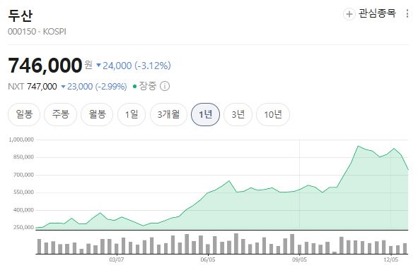 앞서 두산 주가는 공시 직후 8.22% 하락한 77만원으로 마감했고, 19일 오전 11시 34분 기준으로는 74만6000원으로 전일 대비 3.12% 하락한 상황이다. 시장에서는 인수 자금 조달 부담이 주가 하락의 직접적 원인으로 분석됐다.