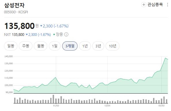삼성전자 3개월 주가 추이. 사진=네이버 주식 갈무리
