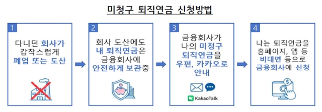 직장의 폐업이나 도산으로 근로자가 받지 못한 퇴직연금 적립액이 지난 9월 기준 1309억원에 달하는 것으로 나타났다. 금융당국은 근로자가 잃어버린 퇴직연금을 보다 쉽게 찾아갈 수 있도록 제도와 시스템을 전면 개선하기로 했다.4일 금융감독원에 따르면 지난 9월 말 기준 미청구 퇴직연금 적립금은 총 1309억원이며 관련 근로